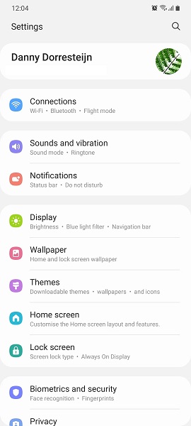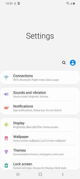 Ето така изглежда менюто с настройки. Samsung са се постарали да освеждат целия интерфейс на смартфона, навсякъде из менютата. Още на пръв поглед ще забележите нови икони във всички категории. Една от забележимите промени е преместеното меню Samsung account, най-отгоре.