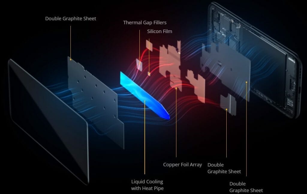 За справяне с топлината е предвидена система за течно охлаждане, чрез която се постига 100% ефективно покритие на вътрешните топлинни източници, и понижаване на температурата с 12,5%. Използвани са графитни плаки и медни изпарители с диаметър 8 мм, което увеличава площта на разсейване на топлината със 176,9%, а обема до 410 mm³.