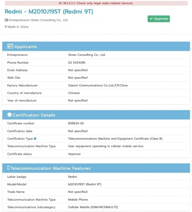 Нов смартфон на Redmi с модел M2010J19ST получи сертификат от Националната комисия за радио и телевизия в Тайланд (NBTC). На страницата на новото устройство в базата данни на бюрото за сертификация, се вижда, че смартфонът ще се продава в Тайланд под името Redmi 9 T. Това не е изцяло нов смартфон, а по-скоро ребрандиране на съществуващо устройство на компанията.