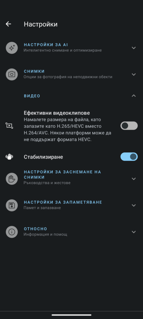 При заснемане на видео можете да избирате дали фенерчето да е включено за допълнително осветление, а също и микрофона. Можете да избирате съотношението на страните (по подразбиране е 9:16), а също и честотата на кадрите – по подразбиране е 30 fps.