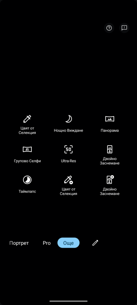 По подразбиране в интерфейса на камерата има бърз достъп до режимите забавен каданс, видео, снимка, портрет, Pro, а с бутона “още” се зареждат и останалите. Можете да промените режимите, до които да имате бърз достъп от писалката.