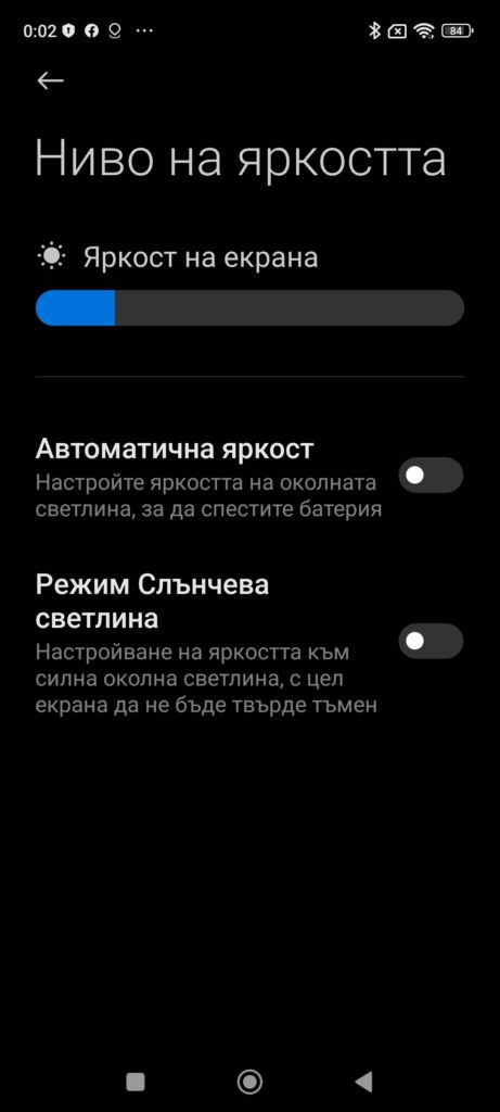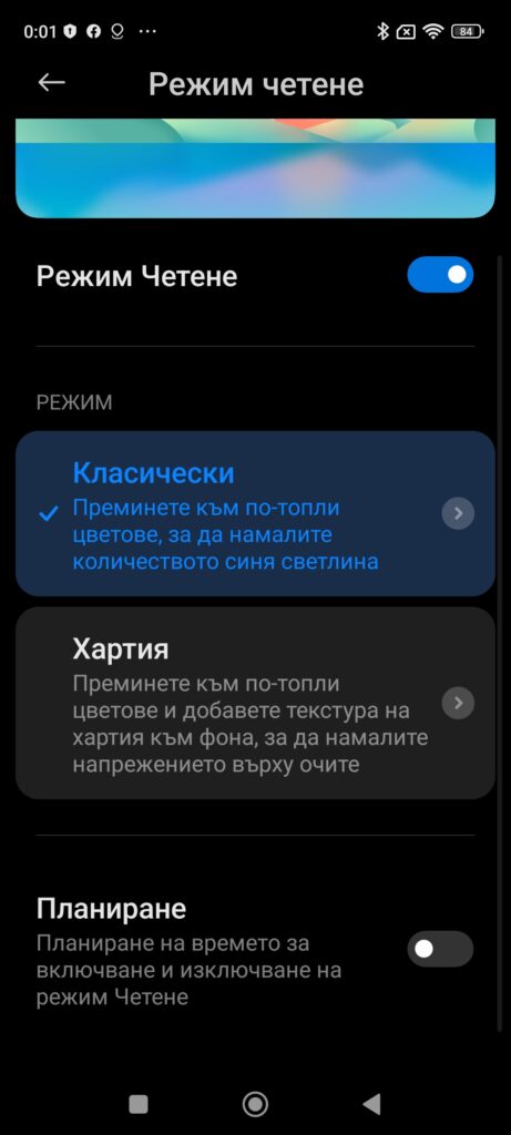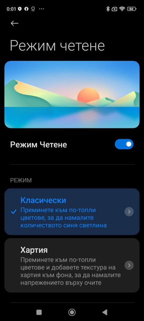 Разполага с филтър за синя светлина, режим за четене с имитация на хартиена текстура и режим за ползване при ярка светлина, като на плажа. За да превключите на него – трябва да влезете в настройките на дисплея и да изключите автоматичната яркост.