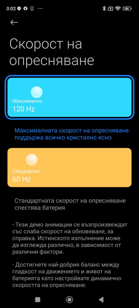 За пестене на енергия от батерията, при избор на високата опреснителна честота 120Hz – тя се прилага, ако докосвате екрана – като при геймплей или бързи скролване. Ако просто гледате клип, видео в YouTube, Netflix или снимки и в продължение на 3 секунди не докосвате екрана, опресняването превключва от 120Hz на 60Hz.