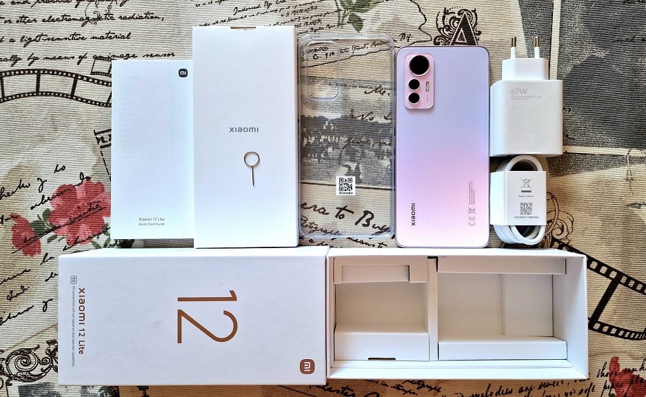 Заедно с телефона – Xiaomi 12 Lite, в кутията ще намерите и прозрачен силиконов кейс – тънък и елегантен с висок борд за камерата, игла за отваряне на слота за SIM карти, книжки с инструкции и гаранции, кабел с конектори USB Type-C и USB Type-A, както и 67W захранващ адаптер.