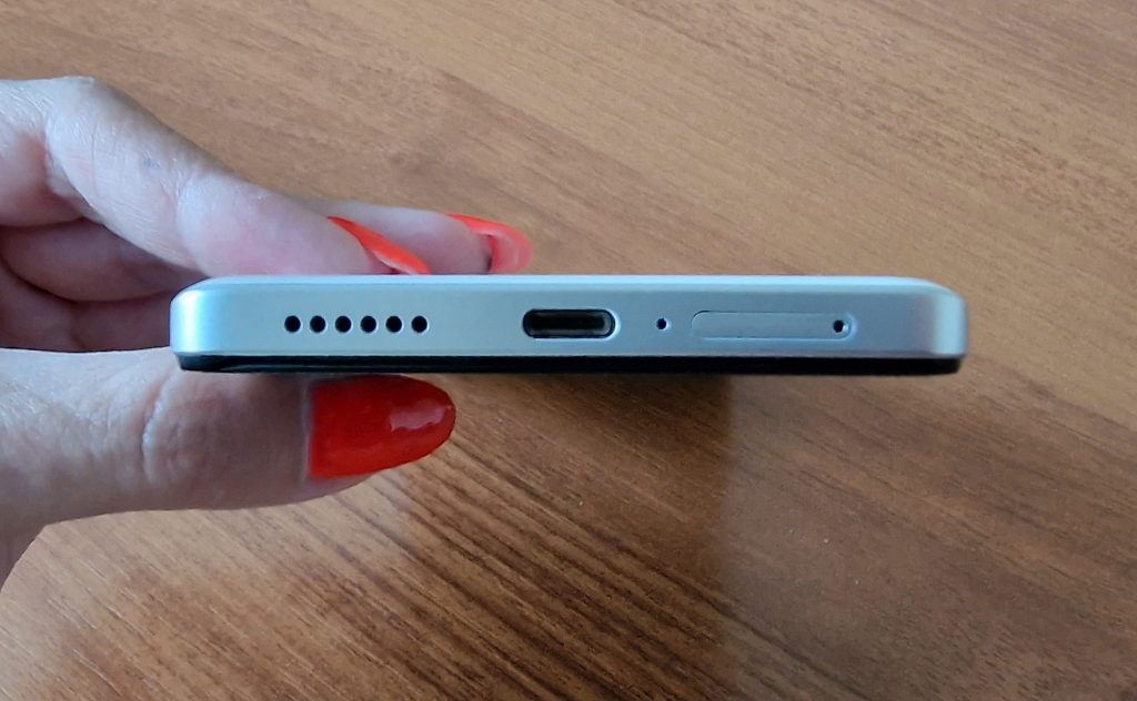 На долната рамка е портът за зареждане (USB Type-C), вторият говорител, основният микрофон и слотът за карти – предвидено е място само за две nano-SIM карти и няма слот за карта за памет.