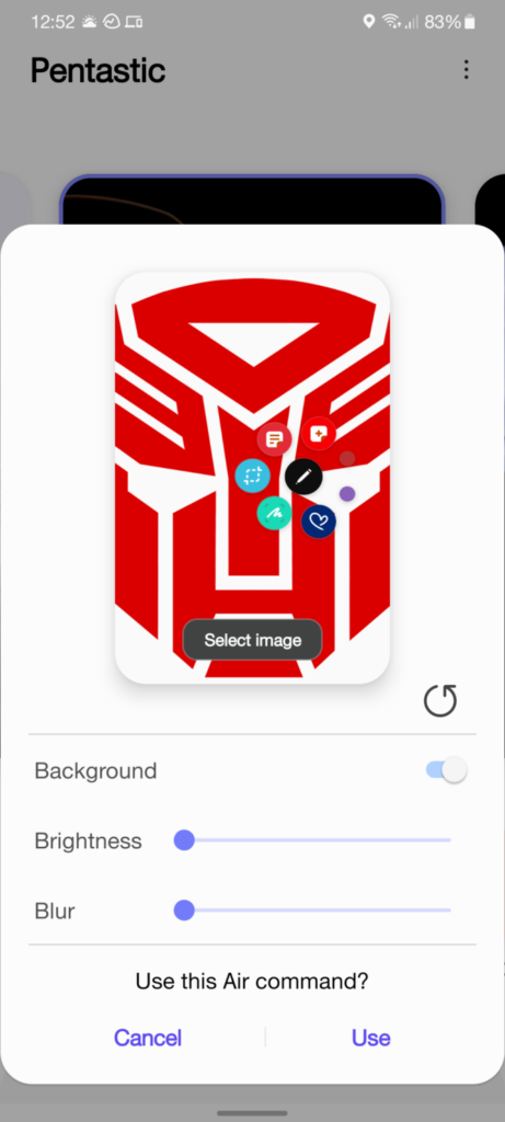 След като отворите Pentastic, докоснете Air Command стила, който искате да използвате. По този начин ще се отвори редакторът, където можете да качите изображение, което ще служи като фон при всеки достъп до Air Command.