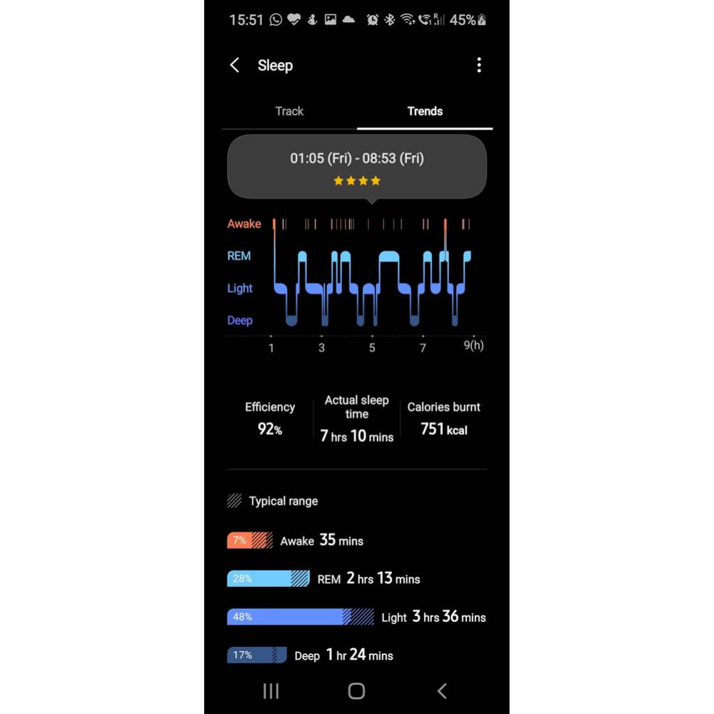 Часовниците на Samsung извършват мониторинг на съня, като могат да записват фазите на REM съня, на дълбокия сън и общото време на сън. При разработване и усъвършенстване на функцията Samsung си партнират с National Sleep Foundation, за да предложат съвети за по-качествен сън.