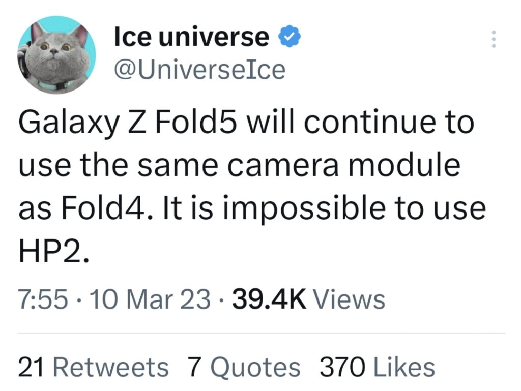 Ice Universe не уточнява защо не е възможно Galaxy Z Fold 5 да използва сензора ISOCELL HP2 и дали това е свързано с разходите или поради технически/пространствени ограничения, наложени от сгъваемия форм фактор. Каквато и да е причината обаче, изглежда, че Galaxy Z Fold 5 ще използва основната камера на Galaxy Z Fold 4.