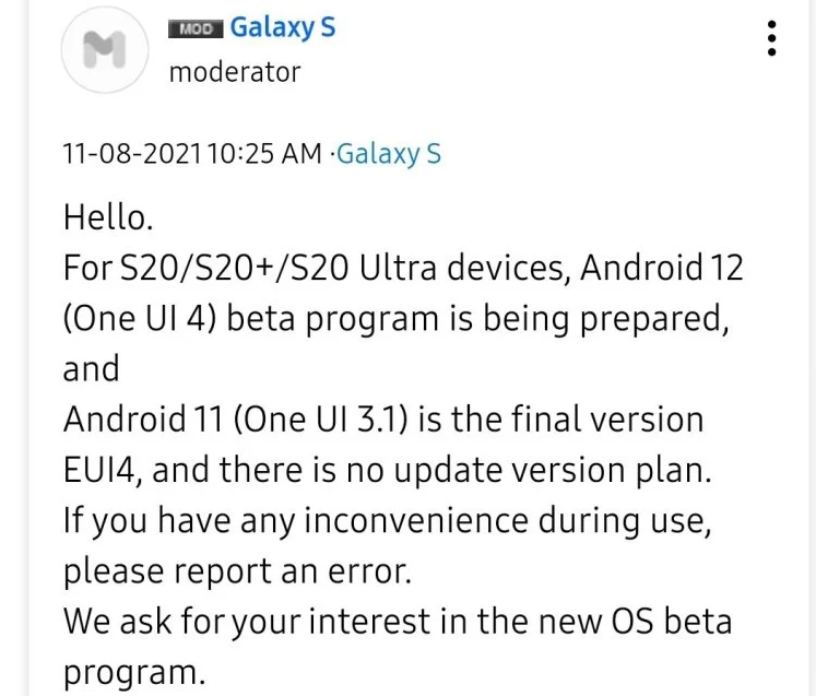 Информацията идва от модератор на форума Samsung Members. Съобщението гласи, че Samsung подготвят бета програмата за Galaxy S20 линията. Изглежда и, че версията на фърмуера EUI4 на One UI 3.1 ще е последната актуализация преди One UI 4.