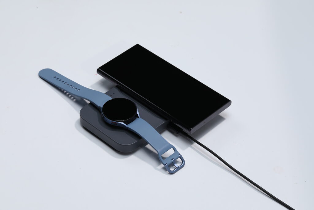Пълният пакет включва: смарт часовник Samsung Galaxy Watch 5 44 mm (без LTE) в цвят Blue Sapphire и 15 W безжичен адаптер за зареждане на две устройства.