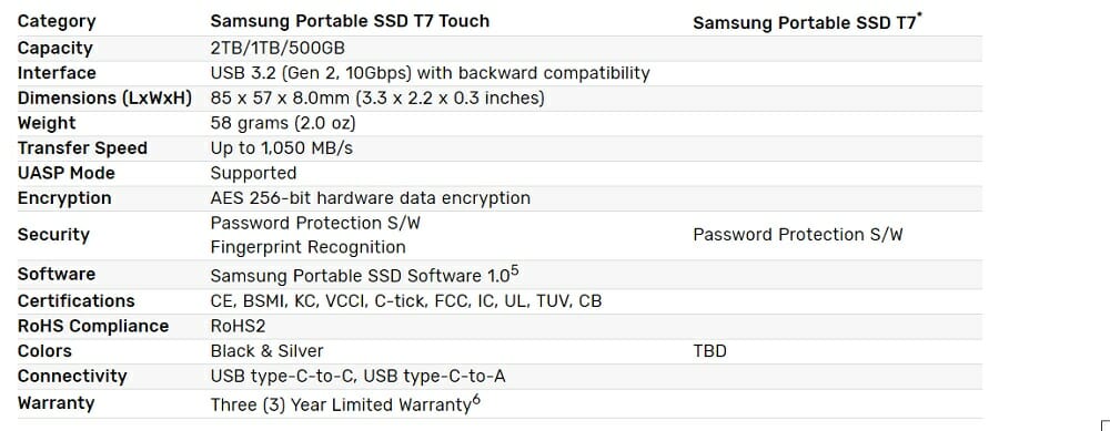 С T7 Touch. Samsung целят да предоставят по голяма защита на данните, които ще се съхраняват на него, като са добавили скенер за пръстови отпечатъци. Скоростта тук също се е повишила, като предлага двойно по-бърз траснфер на данни, в сравнение с модела от миналагата година SSD T5 .