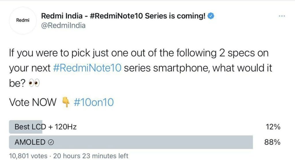 Днес по-рано от Redmi India пуснаха анкета, която малко след това изтриха. Вероятно компанията е очаквала друг отговор и не харесала реакцията на феновете. Въпреки желанието им, екрана да бъде AMOLED с опреснителна честота от 120Hz, това няма да се случи. Подбранда Redmi се стремят да запазят ниската цена на устройствата, а технология като AMOLED би оскъпила крайната им цена.