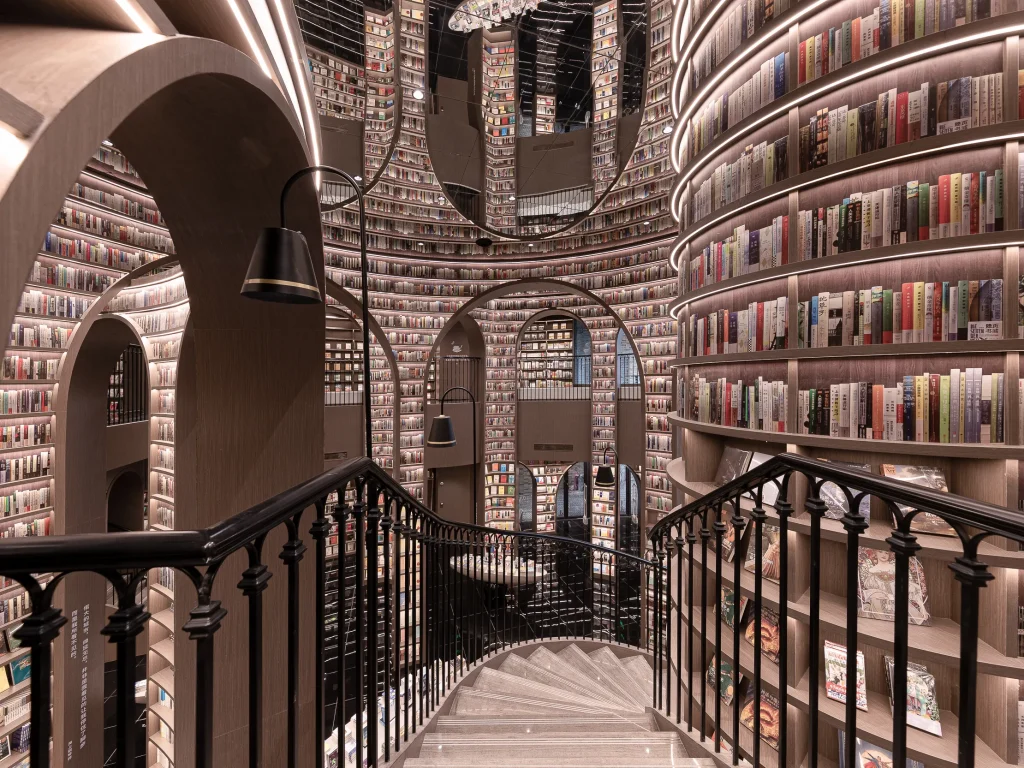 Библиотека като от сън – със спираловидни рафтове, огледални подове и тунели от книги. Идеална за футуристични, артистични и концептуални кадри.