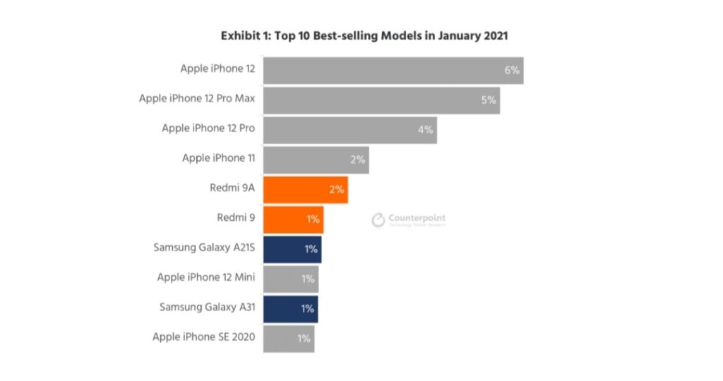 Първите три места са за iPhone 12, 12 Pro Max и 12 Pro, съответно с 6%, 5% и 4% пазарен дял. Тези три модела представляват 71% от общите месечни продажби на Apple.