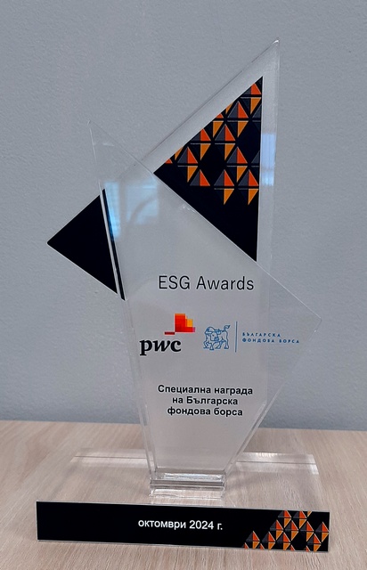 На 30 октомври 2024 г. в Милениум център, гр. София, се състоя официална церемония по награждаване на победителите в конкурса “ESG Awards 2024” – инициатива на Българската фондова борса и PwC, която цели да отличи организации, активно прилагащи устойчиви бизнес практики и иновативни решения, допринасящи за опазването на околната среда и социалното благоденствие.