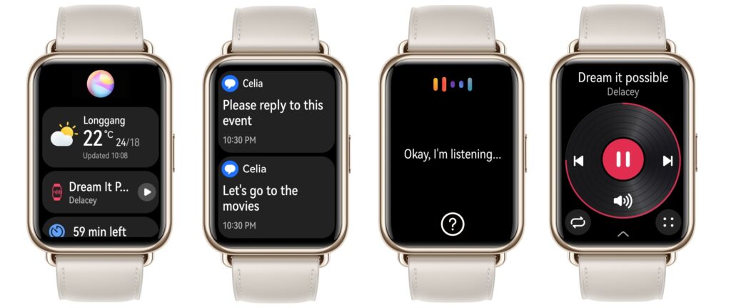 С плъзване надясно по екрана, се зарежда HUAWEI Assistant∙TODAY. На дисплея на HUAWEI WATCH FIT 2 ще се зареди информация за времето или възпроизвеждането на музика. С този жест можете и да събудите Гласовия асистент Celia за лесен достъп до услуги.