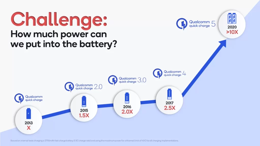 В момента Qualcomm използват своя стандарт Quick Charge 5, които позволява зареждане на батерията от 0% до 50% за около 5 минути, чрез така наречената технология „Dual Charge“: