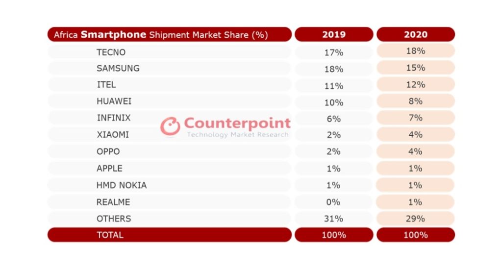 Huawei продължават да заемат четвъртото място в Африка въпреки предизвикателствата, пред които е изправена компанията. Counterpoint твърдят, че първите три тримесечия са били добри, но доставките са намалели значително през четвъртото тримесечие. Пазарният дял е спаднал от 10% на 8% и се очаква да пада допълнително.