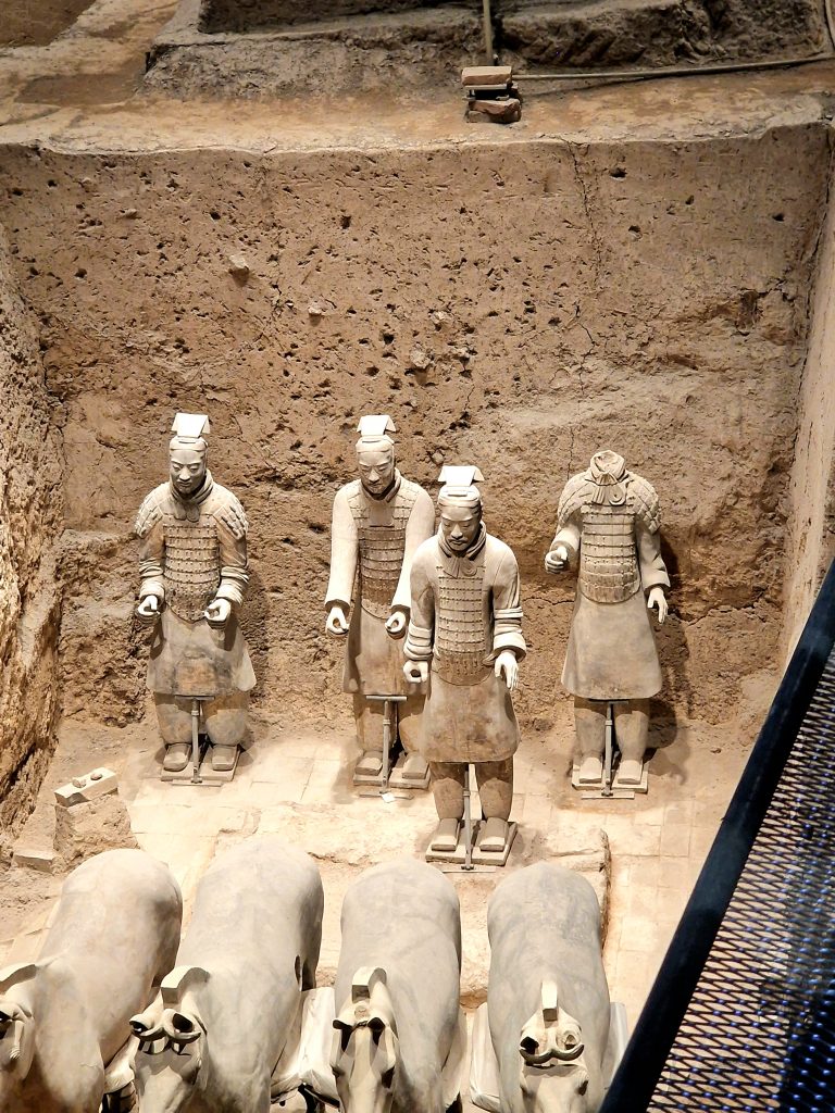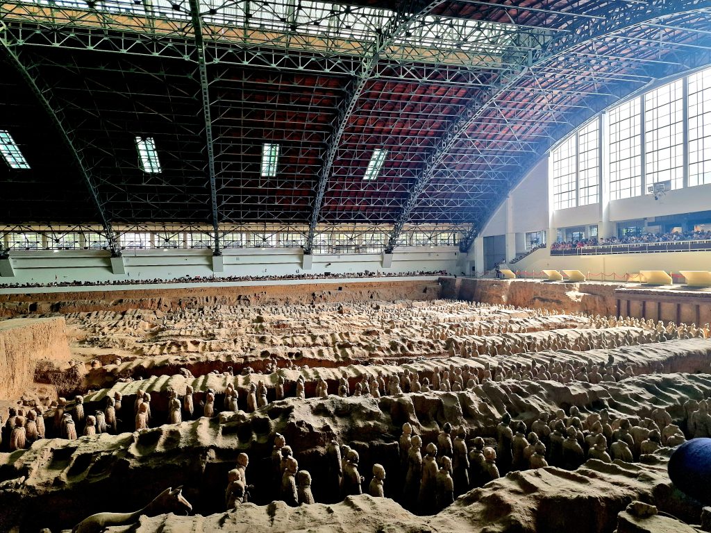 Когато застанете пред редиците на Теракотената армия, усещането е не като в музей, а като в реално бойно поле, замръзнало във времето. Стотици фигури – и всяка различна. Хиляди лица – и нито едно повторено. Армията, погребана заедно с Цин Шъхуан, е не просто архитектурен подвиг – тя е психологически портрет на империята му.