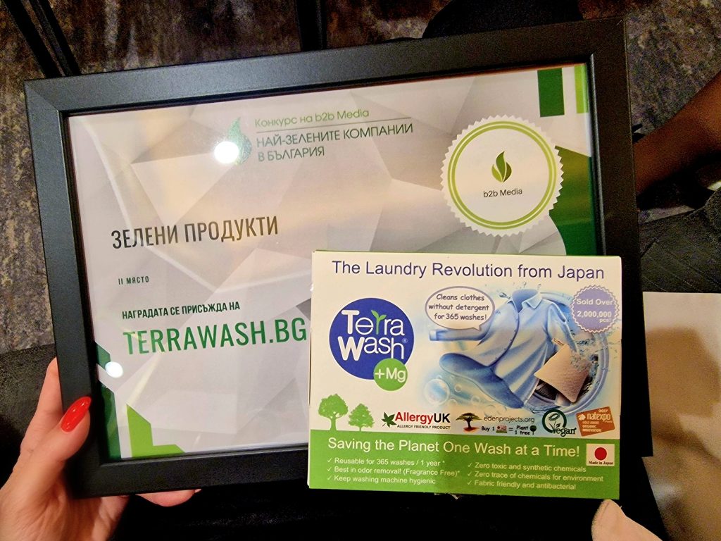 Японският еко прах за пране от пречистен магнезий Terra Wash+Mg беше отличен с престижната награда „Зелен оскар“ в конкурса „Най-зелените компании в България 2025“, организиран от b2b Media.