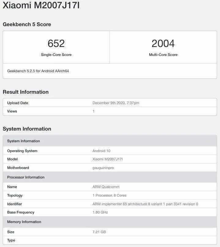 Освен номера на модела, е посочено и кодовото име „gauguinpro“, което съответства на Redmi Note 9 Pro 5G. Така, неизвестният Qualcomm SoC, който работи на тактова честота 1.8GHz, вероятно е Snapdragon 750G. Смартфонът работи с Android 10 и се предлага с 8 GB RAM.