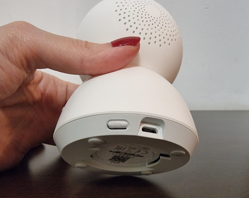 Включването към захравнането се осъществява с кабел в micro USB порт на гърба в долната част на камерата. В ляво от него е “Reset” бутонa за reboot на камерата. Reboot може да се осъществява и дистанционно през интерфейса на телефона. Във видеото в края на публикацията можете да видите как.
