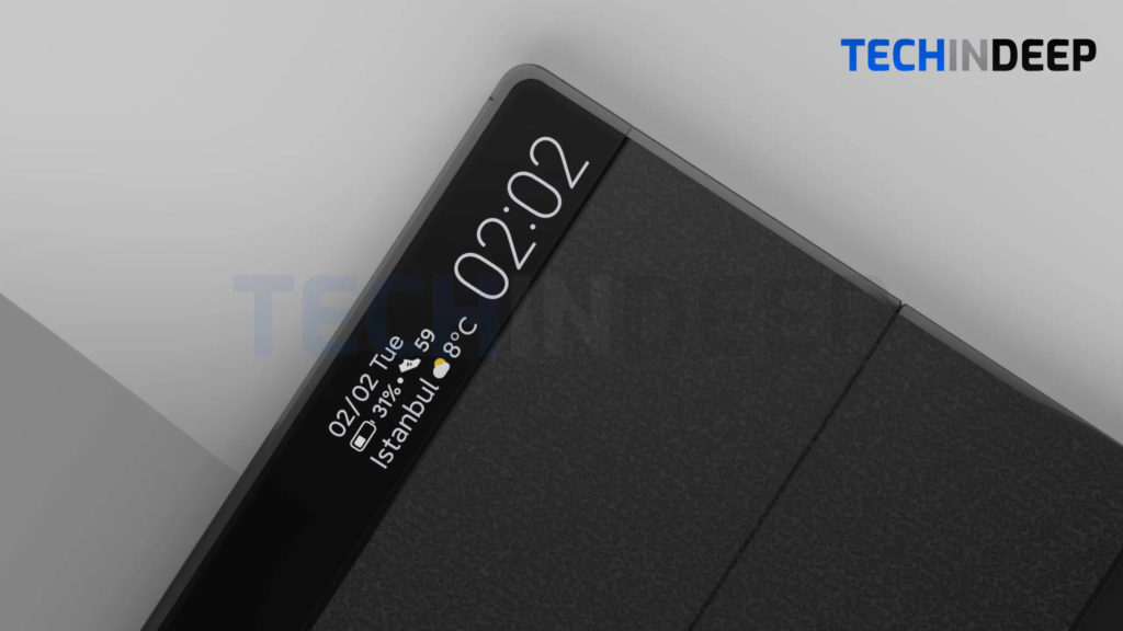 На гърба на устройството, има малък вторичен екран за показване на известия с AMOLED технология и има резолюция 840 × 2520.