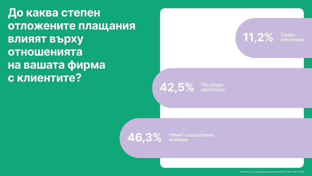 Сред анкетираните компании 42,5% дават ясен сигнал, че отложените плащания влияят по-скоро негативно върху отношенията на фирмата с партньорите им, а 11,2% от тях определят последствията като силно негативни за бизнеса им.